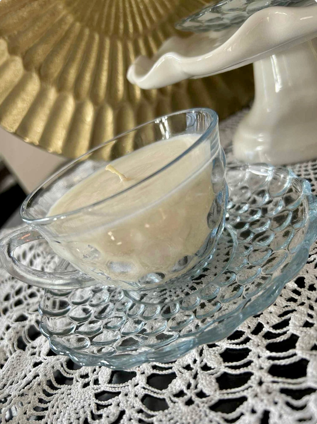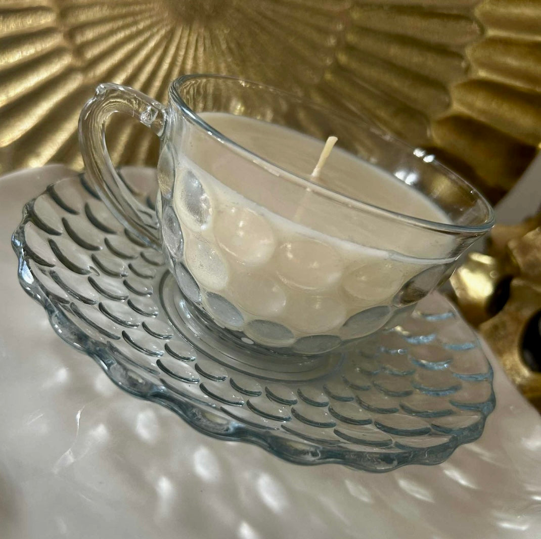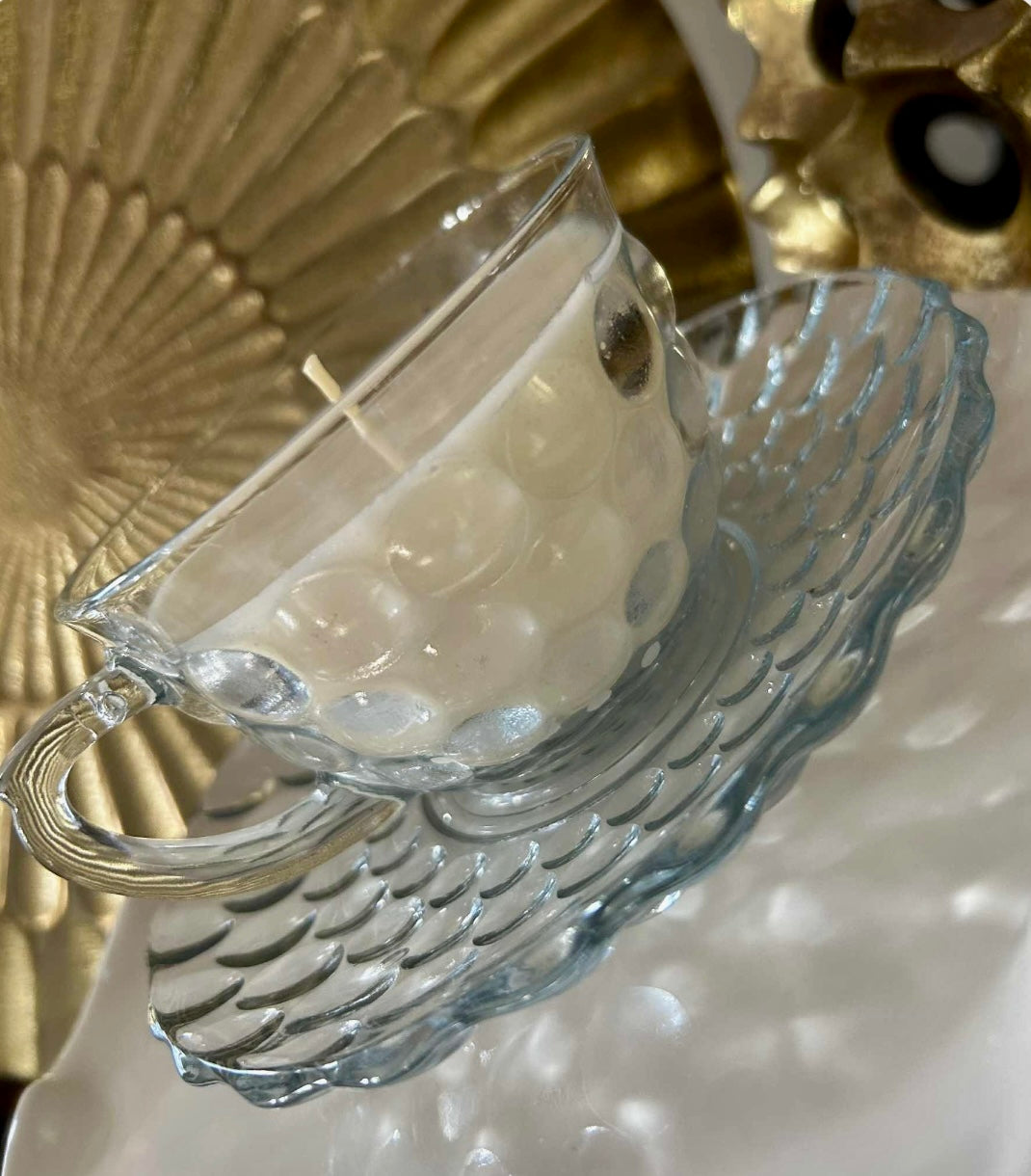 Experience the timeless beauty of our Vintage Blue Sapphire Bubble Glass Soy Candle, now paired with a matching vintage-style saucer plate — perfect for displaying as a decorative accent. Each set is hand-poured and assembled in partnership with Creations dans les Bois, celebrating sustainable craftsmanship and timeless design.